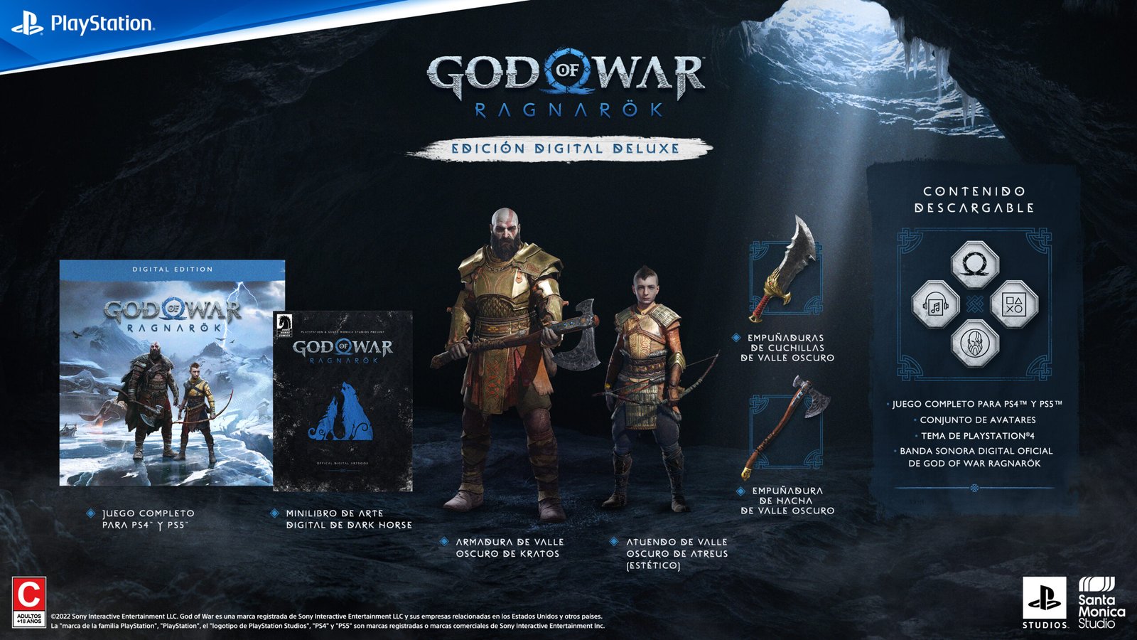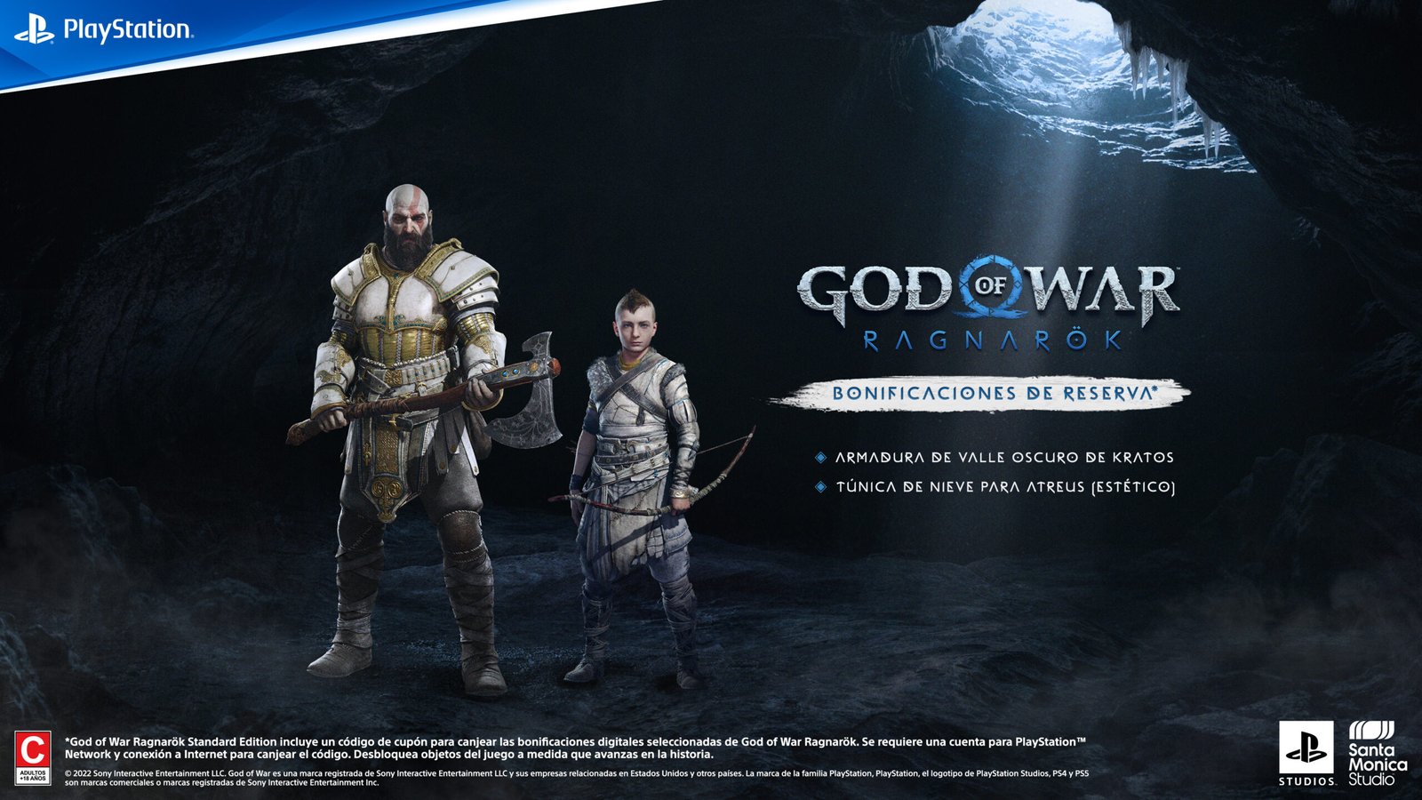 Cuando compres God of War Ragnarök antes de su lanzamiento, recibirás la Armadura de nieve para Kratos y la Túnica de nieve de Atreus (estéticos). God of War Ragnarök Standard Edition, Edición de Colección y Edición Jötnar incluyen un código de cupón para canjear algunas de las bonificaciones digitales de God of War Ragnarök.